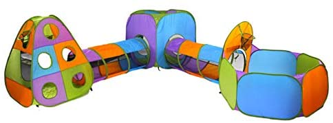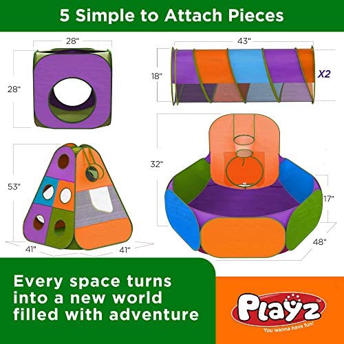 Playz 5-Piece Kids Pop up Play Tent Crawl Tunnel and Ball Pit with Basketball Hoop Playhouse for Boys, Girls, Babies, and Toddlers (Purple, Orange, Yellow, Red, Blue)