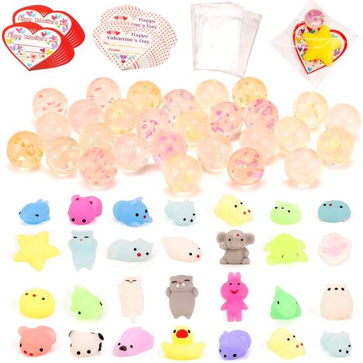 Value Pack: The kids valentine party favors set includes 28pcs 27mm bouncy balls, 28pcs mochi squishes, 28pcs valentine cards featuring 2 designs, and 28pcs packing bags Mochi Squishies(random style): These squishies toys are made from safe and environmentally soft rubber material, can be squeezed and pulled at will, soft touch, animals shapes looks super cute, not only suitable for toddlers and kids over 3 years old, but also perfect for adults to release stress. These small squishies can be rinsed with water directly when dirty, very convenient Bouncy Balls: Made of rubber, lightweight, good elasticity, high bounce height, translucence style, little hearts hide in these dreamy little balls, very suitable for Kids Valentines Day gifts, gift bag fillings, party gifts, class prizes, carnivals Exquisite Valentines Day Gift: Fill the bag with these cute mochi squishies, dreamy bouncy balls, and heart-shaped cards, this match is very suitable for kids to give their friends on Valentines Day. And it must be a good choice as an exchange gift for classroom activities Wide Application: Except for Valentines Day gifts, these bouncy balls and mochi squishes also can be kids birthday gifts, treasure boxes, class prizes, giveaways, goody bags, Easter trinkets, Easter Basket Stuffers, and so on