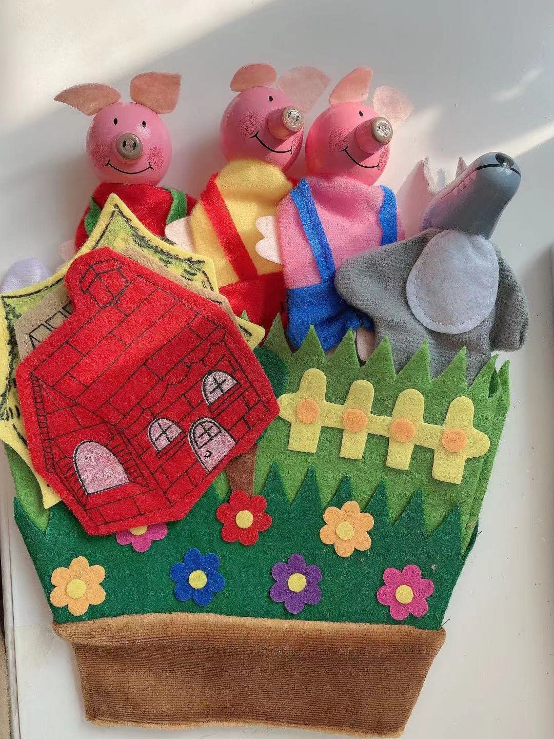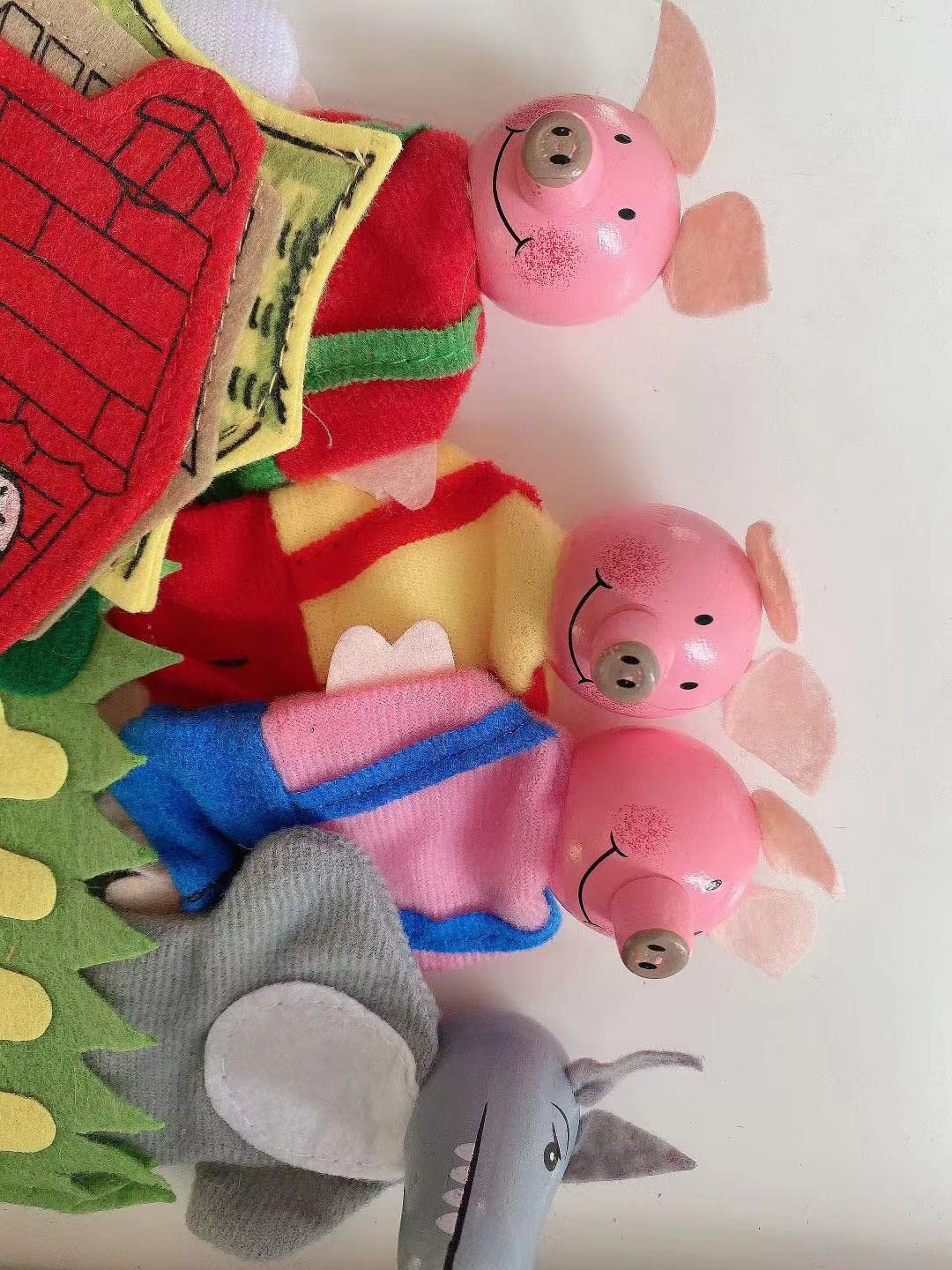 Three little pigs and a gray wolf. Size: 24 cm * 20 cm This cartoon glove toy uses different animal images as finger puppets. Each finger puppet can play a role, making the story more vivid, interesting and interesting. Parents can tell their children the story of three little pigs and a big gray wolf. This cartoon glove is lovely and brightly colored. It will attract the attention and love of your children. The finger puppets are made of fine, soft fabric, comfortable to wear and free to move their fingers. Or you can wash it.