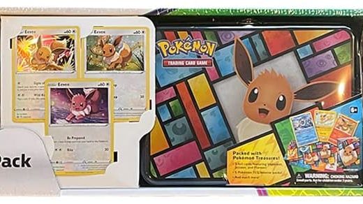 Pokemon Trading Card Game Treasure Chest with 3 Eevee Rare Collectors Cards with 2 Poke Ball Tins Toys Gift Set
