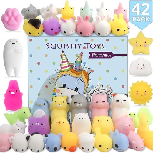 Package Includes: 42 Pack mochi squishy toys. There are unicorn, rabbit, cat, panda, elephant, smile cloud and some other mini kawaii animal squish…