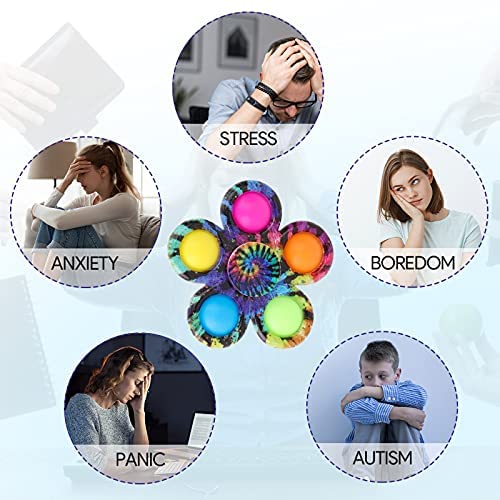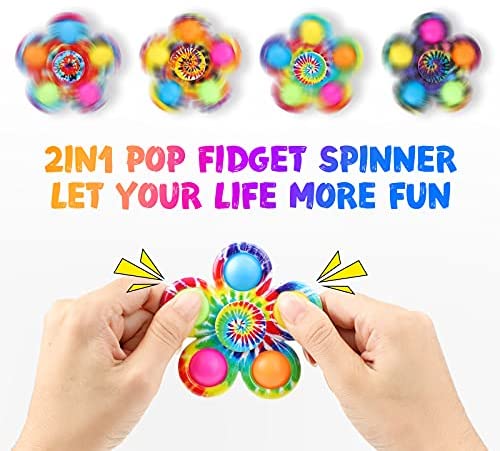 2-in-1 Design New Tie-dyed Fidget Toys. This popped fidget spinner is an upgraded version of the pop fidget toy and combines the traditional fidget spinner with pop and tie-dyed printing. You can not only make the fidget spinner rotated, but you can also press around bubbles to make a pleasant “POP” sound. 2 in 1 fidget Spinners for kid adults can give you more fun. Stress & Anxiety RelieverYou can hold the center part of the pop fidget spinner with two fingers, then rotate it with your other fingers or the anther hand. Or press the around bubbles they make a slight sound “pop ”.Which will help you release pressure, is the best gift for people suffering from ADHD, obsessive-compulsive disorder, autism, anxiety, etc. Safe MaterialUPOFFICIS Push Bubble toys pack is made of high-quality ABS and silicone material, durable and reusable. With high-speed bearing, you can feel smoothness when you play with the bubble sensory toys. Will bring more fun to you. Easy to Use and CarryThis push & pop fidget toy is small in size, light in weight. You can easily put the fidget spinner into your pocket, handbag, or purse and portable to bring into schools, classrooms, and offices, trips. Great Kids Favors & Perfect GiftUPOFFICIS fidget toy pack perfect for kids birthday presents, kids party bag fillers, kids party supplies, Christmas gifts, Christmas stocking stuffers for kids, wonderful incentives classroom prizes, etc. Combination of pleasant sounds and wonderful colors, kids will definitely love them!