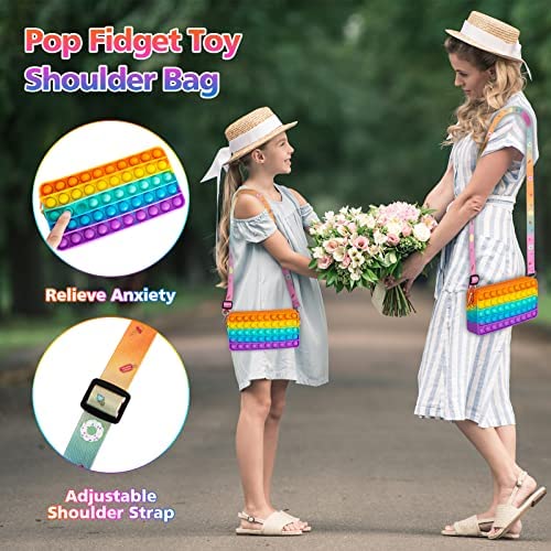 Multi-Function Fidget Toy Bag The unique rainbow color design of pop it purse can improve childrens concentration. Press the bubbles down, the bubble fidget toy make a slight popping sound, enjoy the joy of pressing and effectively relieve anxiety and stress, eliminate irritability. The pop bag toy can be used both as a bag/handbag/purse and as a decompression toy when you need it. Pop it Fidget Toys Can Relieve Stress & Anxiety Press the fidget bag soft buttons, comfortable touch, promote tactile stimulation. It can relieve peoples stress, release anxiety, rehabilitate your mood and get rid of boredom during the daily life. The popping fidget toy suitable for those suffering from ADHD, autism, anxiety, etc. Safe & Premium Material Have a good time playing without worrying. The pop fidget toy bags are made of high quality natural silicone, with a smooth rubber surface, soft rubber buttons, durable, not easy to damage and reusable. Kids are easy and safe to play pop fidget toy. Easy to Use and Carry Our pop shoulder bag is 7.28*1.57*3.54 in. It has enough capacity for coins, small purse, mobile phone and so on. Every kids popper fidget bag comes with a adjustable rainbow strap and the strap length can be adjusted according to the required size. Pop it purse is lightweight and easy to carry. You can take it to school, playground, super market, etc. Pop fidget purse is also suitable for outdoor activities, as camping, traveling dating, or as a daily bag and so on. Perfect Gift Idea Our Rainbow color pop fidget bag has a unique design, colorful and soft feel. It will be very excited to receive such an amazing gift. And also wonderful school supplies gifts for kids. Whether you give pop shoulder bag to yourself or to someone you care about. Our pop fidget bag is an perfect gift for your girls, mother, daughter, wife in children’s birthday’s party, Halloween, Christmas, valentine’ s day, new year party.