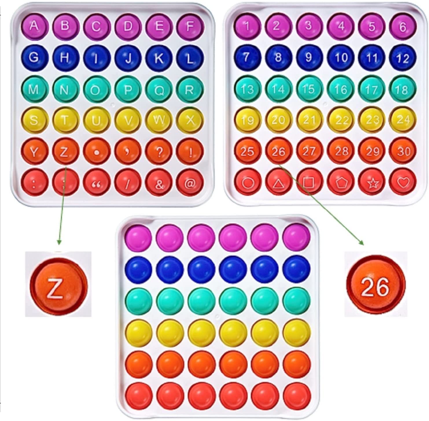 Numbers and Alphabet Printed On Push Bubbles: Educational learning tool and helps fine motor skills Washable: Reusable and Eco-friendly Lightweight: Portable and travels well Durable Frame: Easy to hold and user friendly Premium Package: Gift ready 3 pack for any occasion