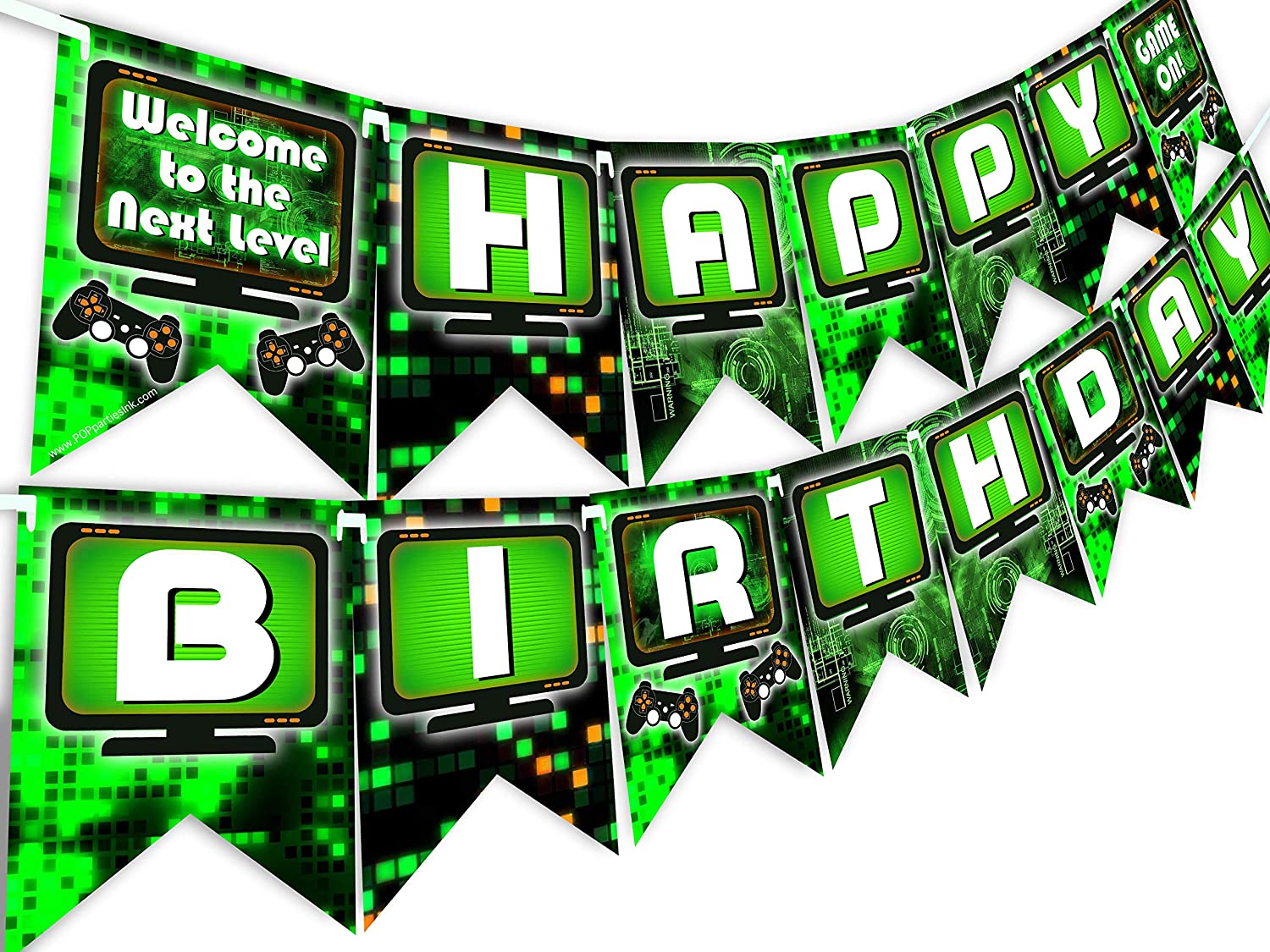 POP parties Gaming Party Happy Birthday Banner – Video Game Party Supplies – Game Truck Party Decorations – Gaming Green
