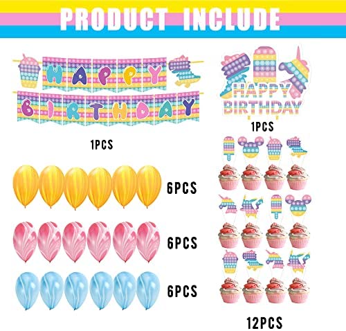 Pop Push Bubble Birthday Party Decorations Includes 32pcs: 1 pcs Happy Birthday banner 1 pcs big pop cake toppers 12 pcs cupcake toppers 18 pcs bright balloon set with 3 styles Acecessory: 1x banner rope1x Balloon Ribbon24pcs glue point for fixed balloon