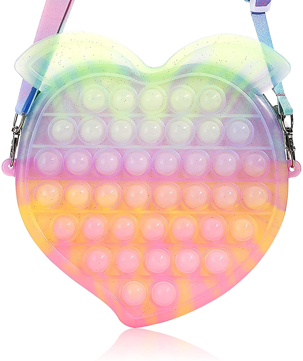 Unique Girls Pop Fidget Toy Shoulder Bag:Your best-loved pop fidget girl toys is now a cute peach fidget bag!The colorful, cute and fun costume decorations pop shoulder bag can be carried with you for birthday parties, Halloween parties and more. Press the bubbles until it make a slight pop sound, and then watch the bubbles bounce back magically by themselves! Enjoy the fun of pressing, effectively relieve anxiety and stress, and eliminate irritability. Perfect Girls Size: Our girls fidget toys meet your daily activities. The spacious interior space can put your lipstick, phone, money, sunglasses, wallet, cosmetics, candy and small daily necessities, etc.Every kids popper fidget bag comes with a adjustable rainbow strap and the strap length can be adjusted according to the required size . Safe Silicone Material: Popper fidget bag toys is made of safe silicone material, the rubber surface is smooth and buttons are soft, durable, not easy to damage, reusable, easy to clean.When there are stains, wipe it with water to give a new girls large purse Bag! Stress Relieve Fidget Popper Toy: Fidgets for girls bag has high quality silicone surface, when press the pop gently, the pop fidget purse bag make a ‘pop pop pop’ Sound, enjoy the joy of pressing and effectively relieve anxiety and stress, eliminate irritability. Pop fidget bag suitable for those suffering from ADHD, autism, anxiety, etc. Fantastic Valentines Gifts: The cute push bubble fidget bag can be used as an eye-catching gift for kids, lovers, and friends. It is very popular. You can wrap it into valentines gifts, birthday gifts, Easter, Christmas,Halloween gifts, and school supplies backpack Gifts and more!