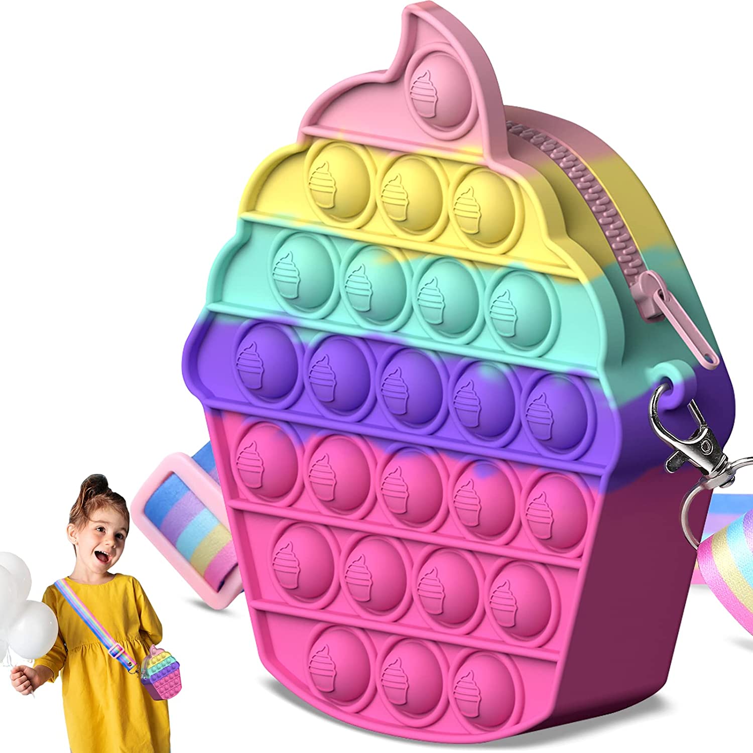 Pop Purse for Girls Crossbody, 2 in 1 Pop Bag Fidget Purse Toy Push Bubble Handbags, Rainbow Silicone Sensory Toys Messenger Bag with Adjustable Shoulder Strap Length for Kids and Aldults(Ice Cream)