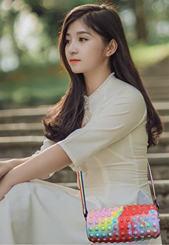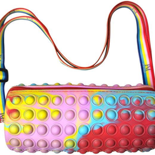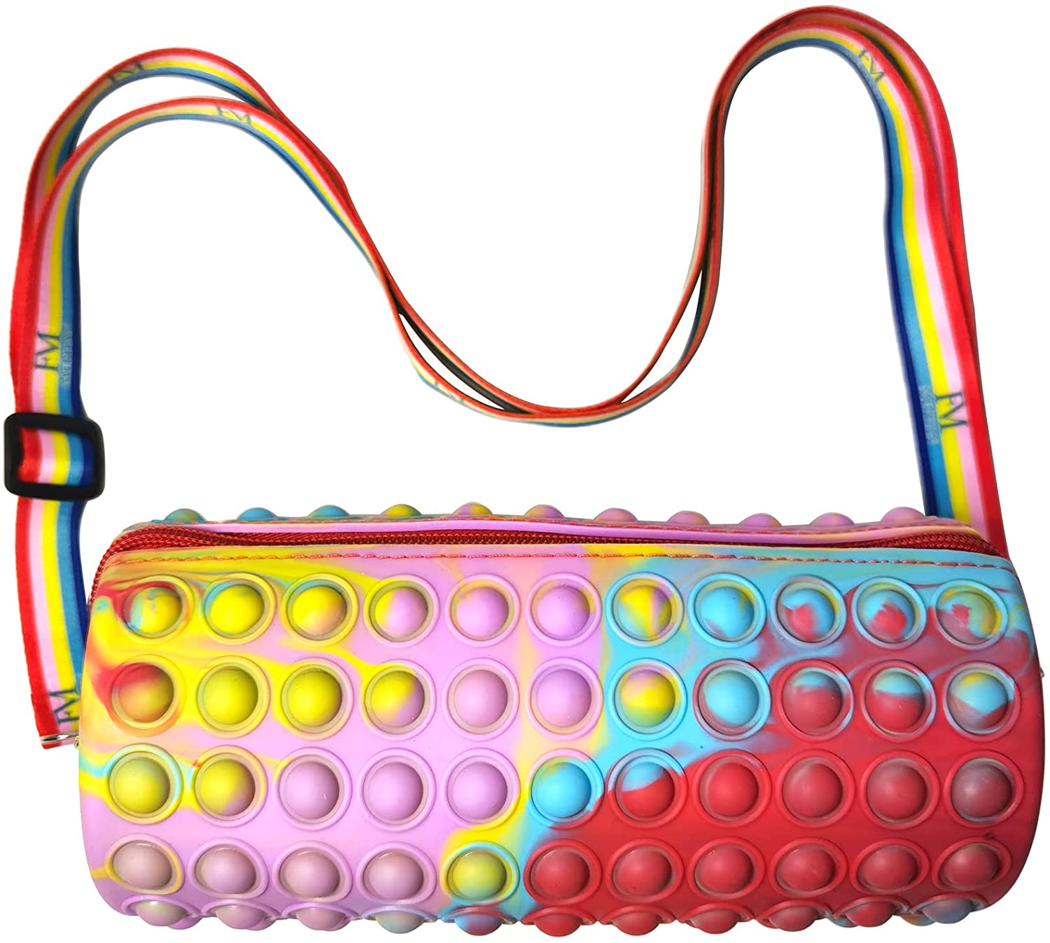 Big pop crossbody bag for girls and women that has enough space with size 3.75 dia x 8 inch and long adjustable shoulder strap of 55 inch length, and easily carry cell phone, make-up tools and other needs Pop cylinder purse toy that can help curb anxiety, relief stress and kill the bored time, when you push the bubbles from inside to outside, it will make POP sound thats attractive Pop purse fidget toys are all the range at present, its a wonderful gift for little girls, mothers, girlfriends, colleagues, school classroom rewards,treasure box,valentine gifts,mothers day, Kids birthday and so on Colorful and Elegant bubble pop handbag is suitable for all ages girls and women,it has light weight and easy to take personal belongings during shopping or touring anywhere, A great on-the-go toy in a vehicle or somewhere Safe Premium Silicone Material: Soft,Comfortable,Washable,Durable,No peculiar smell and safe for children,and the Pop Purse it can be repeatedly pressed thousands of times