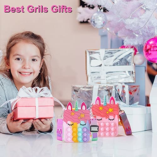 Compact Pop Bag Pop fidget toy bag size: 4.33 * 3.35 * 1.57 in, With chain adjustable maximum length: 44.5 in (You can also match other styles of chains). Shoulder bags have plenty of space for the supplies, such as candy, lipsticks, cosmetics, small fidget toy other daily necessities in this bag, can also be carried with you, which is very convenient. Novel and Cute Design This Pop fidget toys bag is made of natural silicone. which is tough, durable, non-toxic and tasteless, safe and healthy, Feel soft and comfortable, Easy to clean. Unicorn shape, fashionable and dazzling color, dreamy and cute, Let your child be the envy of others. Stress Relieve Fidget Poppers Toy The surface of the bag is filled with bubbles. It is not only a purse bag, but also a simple popper fidget toy. The slight popping sound and soft bubbles bring an excellent tactile experience. Enjoy pressing the bubble. Fun, it can also be used as a fidget toy passage for kids to play with their fidget toys. Let The Fun Be Everywhere The pop fidget toy shoulder bags is lightweight and easy to carry. You can play at the home, bus, car, train, subway, libraries, station, travel, special education classrooms. Pop fidget toys bags helps you beat boredom and simply pass the time, have fun anywhere. Great Gifts for Girls The newest popper shoulder bag is suitable as school supplies and party favors for your kids. Of course, it is suitable for all kinds of holiday gifts, including Birthday, Easter, Halloween, Christmas etc. Your little ones will be extremely excited when they receive such a special gift.