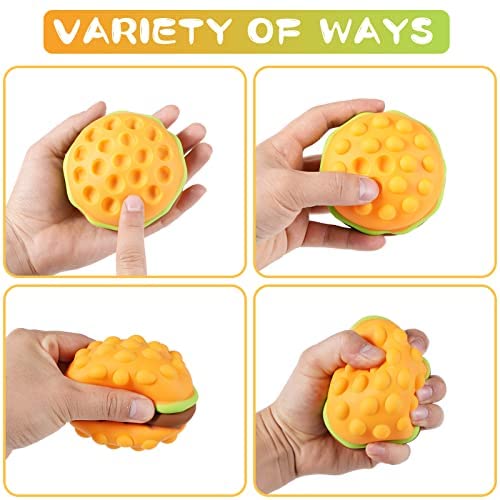 Material:made of non-BPA and non-toxic silicone, which is durable, Stress balls are not easily deformed or punctured, and comfortable for touching. Size: The size of the squeeze poppers its are 3.8inch/9.6cm, you dont have to worry about children eating by mistake. Small size and light weight let you can hold with one hand. It is very easy to store and carry. Release Stress:This 3D popular fidget hamburger ball combines the design of the most popular bubble push fidget game toy and the pressure can be released with a light pinch. Entertainment : These mini pop pack toys are great for everyone. For kids, this mini pop bulk can improve the ability of calculation and thinking. Interactive Toy:Easy interactive sensory toy game, set your own rules which can not only increases intimacy with your friends or families but also cultivate logical thinking and train sensory abilities.