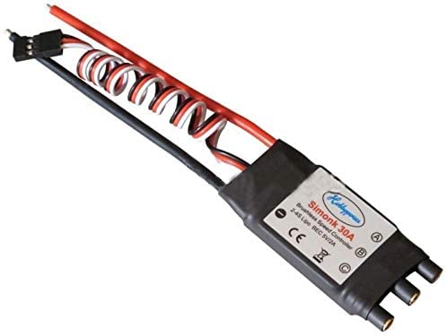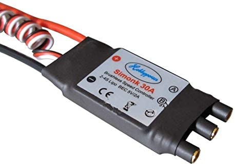 -for sale is 30A SimonK firmware Brushless ESC. -Soldered with 3pcs 3.5mm gold female plug, very convenient to connect motor. -Highest efficiency 100% N-FET design. -Highest accuracy with Crystal Oscillator (Temperature wont affect the PWM -operating range like other cheap ESCs). -No low voltage cutoff, because any cutoff in a multirotor = crash. -No over temp cutoff, because any cutoff in a multirotor = crash. -Super high refresh rate, no buffering of the input signal, resulting in more than 490Hz response rate. -16KHz motor frequency, giving fastest response of the motor, and quietest operation as well (no 8KHz squeal). -Super simple, foolproof operation! Nothing to program other than the throttle range. -ESC Specs: -Cont. current: 30A -Max. current: 35A -Input Voltage: 2-3S lipo / 4-11 cell Ni-MH/Ni-Cd -BEC: 5V 2A (Linear mode) -Size: 55x26x8mm (length 145mm including power cable) -Weight: ~22g