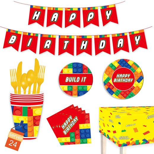 PRATYUS Building Block Party Supplies Including Plates, Cups, Napkins, Spoons, Forks, Knives, Tablecloth and Banner, Disposable Dinnerware Set for Colorful Building Party Decorations, Serves 24 Guests
