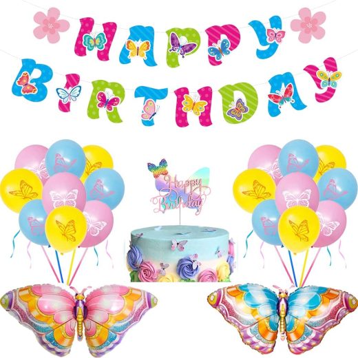 PRATYUS Butterfly Birthday Party Decorations for Boy Girl Colorful Butterfly with Birthday Banner, Cupcake Toppers and Foil Latex Balloon