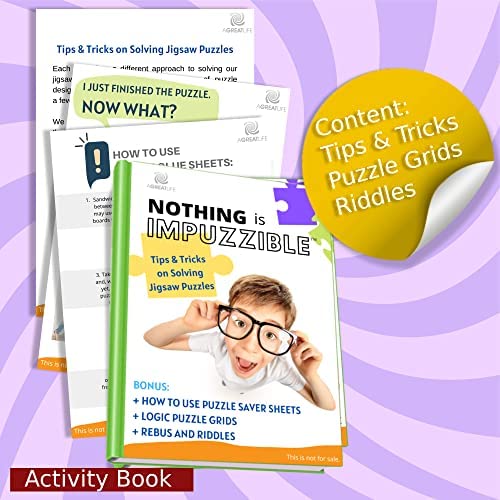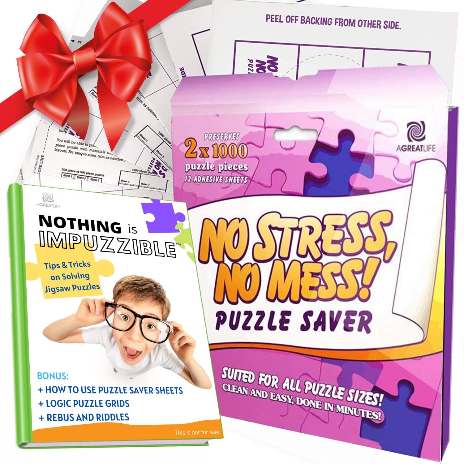 Stickier Than Ever Puzzle Tape: These permanent puzzle saver adhesive sheets have double adhesive formula enough to stick and keep your puzzle masterpieces intact forever. These sticker puzzle sheets are a better, no mess alternative to puzzle glue and puzzle spray. Smart add-on to your puzzle accessories and puzzle supplies for framing puzzles. Easiest To Use Puzzle Adhesive Sheets: Just peel then stick puzzle glue sheets to the back part of your solved pieces. The sheets are conveniently cut into 14 pieces so you can save a portion at a time, or save a giant puzzle at once. Use a puzzle board to flip the puzzle over and stick puzzle glue sheet. Press with a card or by hand to secure. May it be 1000 to 2000 piece puzzle frame, these puzzle glue sheets are suited for all sizes. Stock up on as many AGREATLIFE Puzzle Savers at home. Comes with an Activity Book: The 20-page e-book contains jigsaw puzzle tips and tricks, detailed instruction on how to use our puzzle saver sheets, some quick trivia and a whole lot of fun with the added riddles and puzzles for you to enjoy during coffee break or weekends. Perfect Gifts For Puzzle Lovers: A friend who loves puzzles will surely want these puzzle piece stickers in their puzzle preserver kit. Sneak in a few boxes of AGREATLIFE Puzzle Saver into your gift box for them puzzle lovers – not just a puzzles accessories for adults but also for kids and teens! You may also include this in your kids party supplies or goodie bag. This would make a fun and unique loot bag fillers for kids birthday! Frame Puzzles The Smart Way Using glue can be messy especially when its a big masterpiece like a puzzle with 1000 pieces for adults. AGREATLIFE No Stress No Mess Puzzle Saver puzzle frame kit comes with PUZZLE WALL HANGER. Stick it to your puzzle frame for easy mounting. These hangers come in handy when you have door puzzles or when youre one of the puzzle keepers who love to save and hang up their work on the wall. Ditch the puzzle glue for framing and go the smart way: puzzle glue sheets.