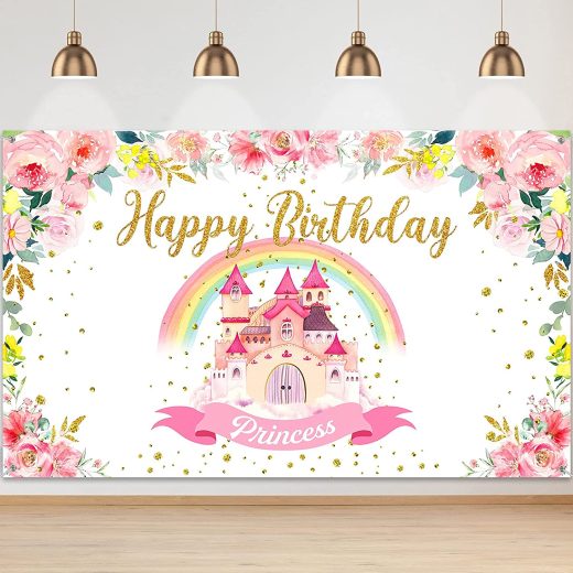 Package includes: 1 piece of princess birthday backdrop with 6 meters long rope for easily hanging, just use the rope through the copper grommet at each corner of the background, and hang it up anywhere; The items will be sent folded may result in crease and it doesnt affect to use Quality material: castle and floral birthday banner is made of polyester fabric, lightweight, sturdy, can be washed, folded for convenient storage, and reusable, you can use it indoors and outdoors in any weather and fold it up for storage after the party Proper size for decoration: princess theme birthday party background is approx. 6 x 3.6 ft (L x W), large enough to decorate your party or decorate a photo booth for taking photos; You can hang it anywhere you need, such as home wall, ceiling, doorway, window, arch or yard Princess birthday theme: this pink castle backdrop is designed with castle, flower and rainbow, it is ideal for pink princess theme birthday party decorations, add the birthday party atmosphere and you can take a photo with family and friends in front of the princess theme backdrop Applicable occasion: castle happy birthday party banner backdrop is suitable for cake table backdrop, birthday party decor, birthday photo booth backdrop, and other party occasions such as product shooting, photography studio