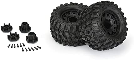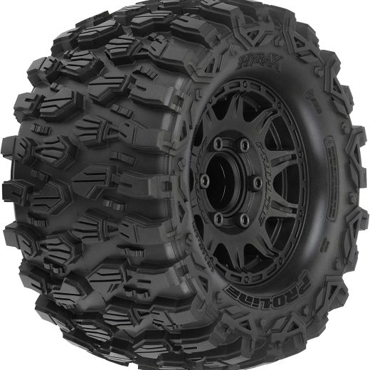 Tire Features: Hyrax All-Terrain Tread for Ridiculous Amounts of Traction and Stability Over-sized Tall Tread is Second-to-None in Durability and Longevity Extremely Detailed Sidewall for that Tough Off-Road Look Official Pro-Line Logo and Hyrax Name Embossed on Sidewall of Tire Less Time Gluing and More Time Having Fun Made in the USA, since 1982 – Read about Pro-Line Racings History Wheel Features: Removable Hexes Allow you to Change Wheel Offsets on the Fly Easily Replace Damaged Hexes or Upgrade to 14mm hexes or 17mm hexes The 2 Most Common Offsets are Included Fits any of Pro-Lines 6×30 Removable Wheel Hexes Wheel Made from High-strength, Durable DuPont Nylon Material Raid 10-spoke Wheel Design Mimics Full-size Racing Wheels M3 Wheel Hex Hardware Included Overview:: Pro-Line is very excited to announce the all-new Hyrax 2.8 tire pre-mounted to the Raid Black 6×30 Removable Hex wheel! We take the guesswork out of your glue job by doing the mounting for you so you can spend more time having fun! Pro-Line is bringing the extremely popular Hyrax rock crawling tread to the 1:10 Monster Truck scene with the Hyrax 2.8 tire! Whether it is loose or hard-packed dirt, sand, snow, street, or gravel, the Hyrax 2.8 tire is up to the task. The Hyrax 2.8 tire was designed to have ultimate traction combined with long-lasting durability. Each tire lug is shaped to dig into whatever surface you are running on and is ultra-thick so that it is extremely durable. The Hyrax 2.8 comes Pre-Mounted on a true next-generation 2.8 wheel design from Pro-Line, the Raid 2.8 Removable Hex Wheel for all 2