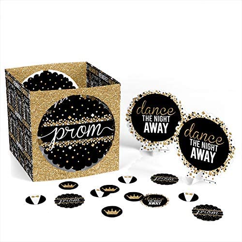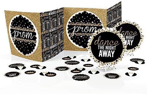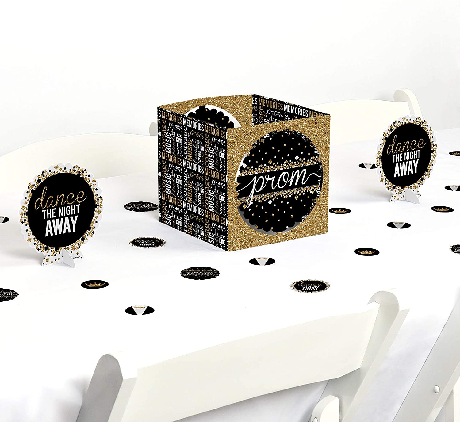 Prom Table Decoration Kit INCLUDES 1 large black and gold centerpiece, 2 scalloped centerpieces, 12 scalloped table confetti pieces and 24 round table confetti pieces. Prom party table decorations are perfect for a prom party. Prom party decoration kit SIZE 1 Accordion-Folded Centerpiece (may also be formed into a cube using the included stickers), 30 long x 7.5 tall; 2 Scalloped Centerpiece Stands, 5.5 wide x 5.75 tall; 12 Scalloped Table Confetti Circles, 2.5 diameter; and 24 Round Table Confetti Circles, 1.5 diameter. The unique design and variety of pieces makes this prom dance party decoration kit an impressive addition to any prom party. EASY TABLE DECOR: Prom large centerpiece paired with the scalloped stands looks great down the length of a table or separated onto three different tables and accented with the confetti pieces. Get creative and use the table confetti for DIY party ideas, as well. Hole punch each scalloped circle and sting as a small banner, use as favor tags or add to candy jars. Black and gold centerpiece and decoration kit will make a statement however you choose to use them. PREMIUM PARTY SUPPLIES: Prom centerpiece and table decor kit is professionally printed on heavy-duty cardstock paper with a photo-like shine. They are individually inspected and carefully packaged by hand. Centerpieces and table confetti will arrive flat. Get creative with your DIY party ideas! MADE IN THE USA: Prom – Party Centerpiece & Table Decoration Kit is designed and manufactured at our Wisconsin facility using materials that are Made in America. Prom decoration kit uses a No-Mess Glitter Print: Our decor kit is designed with a printed image of glitter, eliminating glitter flake while maximizing bling effect!