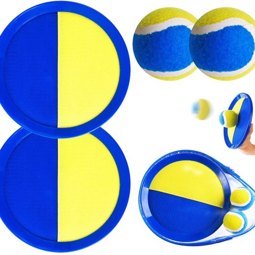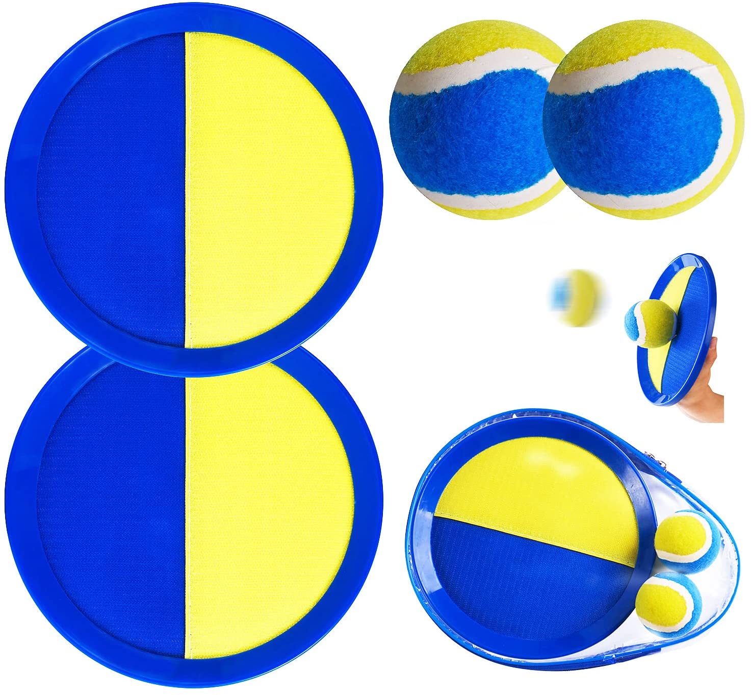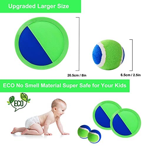 Upgraded Outdoor/Indoor Toss And Catch Ball Game Set:It has a diameter of 20.5 cm /8 inches, which is larger than the old version.We use 100% new materials with high toughness, not fragile.High quality cloth with more dense stitching make the sticky cloth and the plastic disc stronger. Waterproof design, we can play in the beach. The new version catch game set is more durable and strong than the old version Upgraded . Softer and High-quality Throw Sticky Catch Ball Set: We use comfort fabric and high elasticity rubber make the ball much softer with better stickiness, kids can catch the balls easily,will not lose their fun because they keep losing the ball. Always have a lot of fun. Durable and Adjustable Nylon Strap: It is made of stronger Nylon material. And adopts the adjustable design, which is convenient for us to adjust at any time while playing. The length of the strap is enough for adults, so this beach/lawn outside toy is very suitable for kids and adults. Great and fun for adults and family . Keep The Kids Active And Health, Learning Basic Motor Skills: Toss and catch game can exercise kids hand-eye coordination and arm muscles, always keep kids active and happy,release their extra energy.It is also an effective way for kids to know baseball and footballs.This catch ball racket is laboratory tested, safe and non-toxic,safe to play. Outdoor/Beach/Backyard/Park Ball Toy Game for kids,Great Catch Game Sport Gift: It comes with a portable carry bag.when you play catch ball game with your kids outside. Put the ball and paddle back to bag after your play, so you never lost any piece of this toy.It will be a great birthday, Christmas gift for boys and girls age 3-14.
