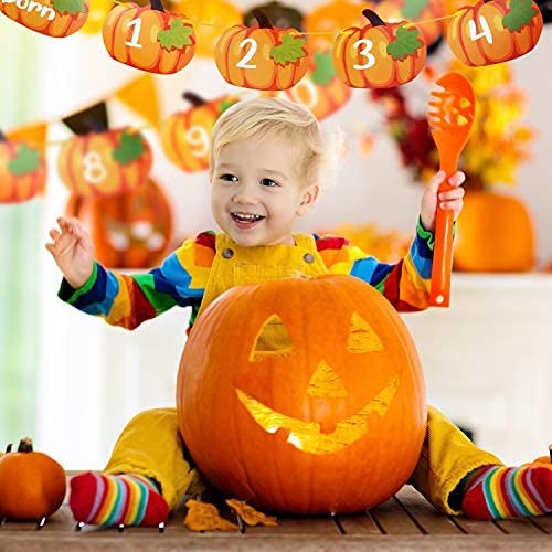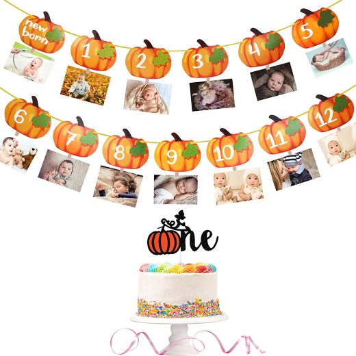 Package includes: 13 pieces of photo cardstocks from newborn to 12 months in pumpkin design, 2 ribbons and 1 pack of black glitter pumpkin cake topper, enough for you to record the meaningful year of your babies Pumpkin banner: pumpkin 1st birthday photo banner is made of art cardboard, thick and strengthened, sturdy and durable, the size of a single pumpkin is 6.69 x 5.51 inch, which can hold 4 x 4 inch, 4 x 6 inch or 5 x 7 inch photos Cake topper: made from two-tier flash card, the sequins on the card are lasting, durable and strong enough to save the next birthday party; the cake topper measures 7 inch wide and 4.5 inch tall, ideal for 8 inch cake to celebrate a 1st birthday Wide applications: the baby first birthday photo banner decoration of pumpkin theme is good for baby room decor, first birthday party, nursery, happy Halloween theme party and autumn baby shower decorations to show your babys precious and meaningful memories at party or other future occasions Easy to assemble: there are holes on the paper cards, coming with a plastic needle, it will make you assemble the monthly photo banner easily with the ribbon, good for baby first birthday party, make your babys first birthday unforgettable with the cake topper
