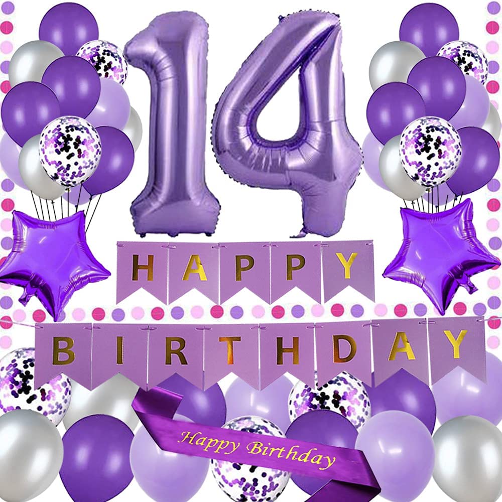 Purple 14th Birthday Party Decorations Purple Happy Birthday Paper Banner Purple 40inch Number 14 Happy birthday Sash Latex and Confetti Balloons Perfect for 14 Years Old Party Supplies Balloons Number 14 yujiaonly