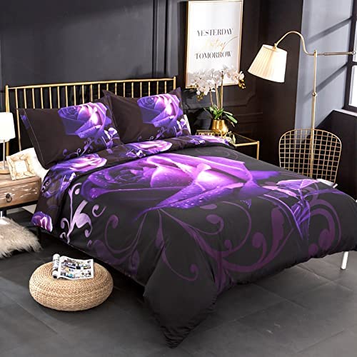 Purple Duvet Cover Twin Reversible Rose Printed Bedding Comforter Cover for Kids Girls Bedding Decor, 2 Pcs (1 Duvet Cover +1 Pillowcase) Soft Microfibe Bedding Set 68
