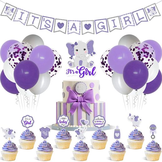 Purple Elephant Baby Shower Decor Purple and Gray Itu2019s a Girl Banner Cake Topper Cupcake Toppers Latex Balloons for Girl Baby Shower Purple Little peanut Welcome Baby Birthday Party Supplies