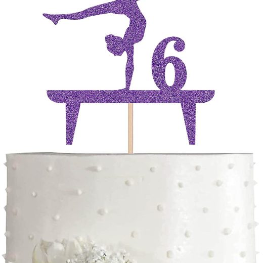 Purple Gymnastic 6 Cake Topper, Girl Rose Gold Glitter Gymnast 6th Birthday Party Decoration