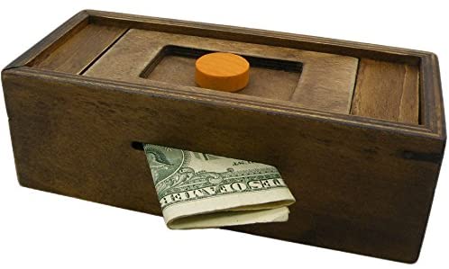 Give cash, Gift cards, small jewelry like ring or a watch in a unique way. Great gift for graduation, and any holiday or special occasion. Slide your coins and bills through this clever box, then solve the challenging solution to opening it. Made of pine wood, finished in a rich walnut stain. Measures 5.9 x 2.55 x 2. Solution included.