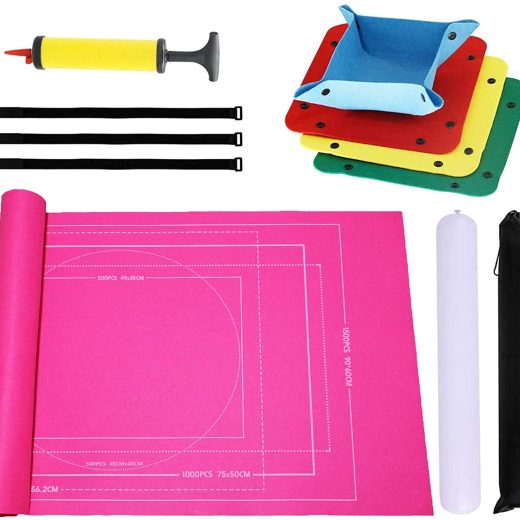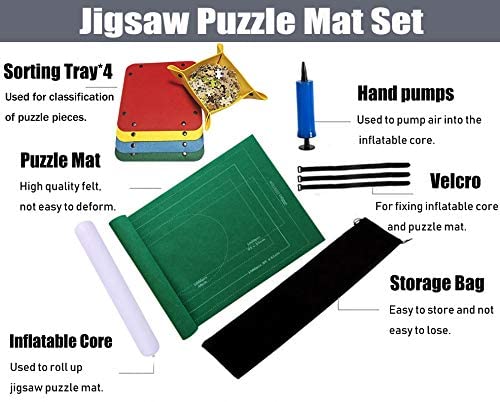 Perfect Ultimate Kit – 1.5MM High quality felt fabric puzzle mat *1,which is lightweight and easy to clean.Pure milky white inflatable rod *1, thickness of 23 silk, not easy to leak.Metal handle air pump *1, firm and durable.Elastic Adjustable Velcro Straps *3.Polyester storage bag *1.Mixed color folding button type puzzle sorting tray *4,which can help you sort the disorganized puzzle pieces. Protection Mat with Unique Design – The frame lines on the puzzle mat can effectively help jigsaw players improve the efficiency of jigsaw puzzles and make it easier, especially for kids and the elderly. Multiple specifications of virtual and real lines are used together so that the puzzle player can clearly identify. Hold Up To 500/1000/1500 Pieces Of Puzzles – Measuring 46 × 26 and holding up to 1500 pieces, ROSSIECA non-slip felt mat ensures every jigsaw puzzle stay put without no creases. The felt is solid color and makes it easy for you to distinguish between the colorful puzzles, giving you just tons of fun! Easy To Use – Just spread the felt mat flat on a smooth, flat surface, starting about 8 inches from the edge, place the inflated tube, roll up and secure your puzzle mat with 3 elastic nylon straps. Our set also contains a polyester storage bag for easy storage and carrying. 4 mixed color folding button type puzzle sorting tray can help you sort the puzzles, allowing multiple children to puzzle at the same time without interfering with each other. The Ideal Gift – This is a perfect gift for your family. Equip the puzzle with the suitable accessories can not only increase childrens interest in puzzles, but also enhance the interaction between you and your children.