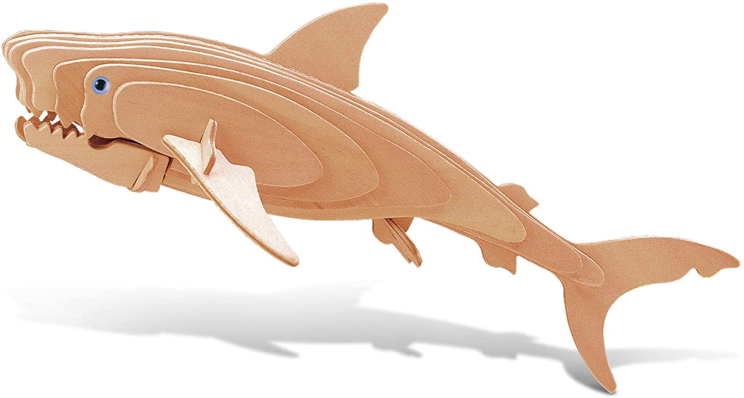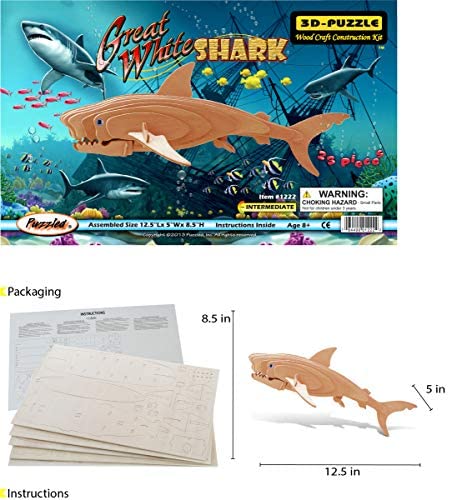 THE GREAT WHITE SHARK WOODEN PUZZLE COMES WITH A UNIQUE DESIGN YOU WILL LOVE – Be proud to display your assembled Great White Shark model and share the love for sea creatures with your loved ones! Ideal for kids & adults with a passion for biology & love for oceanic species. This instructional Great White Shark 3D wood puzzle is part of our Ocean Life collection & will surely help children learn more about this fascinating, massive, & interesting deep-sea creature in a fun and entertaining way! THE GREAT WHITE SHARK DIY 3D PUZZLE IS FOR ANYONE WHO LOVES PUZZLES – The Great White Shark 3 dimensional craft kit is a model to build for adult & kids who love using their brain and hands for creating something. Puzzles lovers at any age or gender will enjoy building this amazing and challenging 23 piece wood toy kit and paint the 3d wood puzzle to make it their own. Great father & son 3d puzzles for boys school project & puzzle for girls get together craft play time with friends and family. INCLUDED WITH THE PURCHASE OF 3D GREAT WHITE SHARK WOODEN PUZZLE KIT – Includes 1 Great White Shark 3D pretty Puzzle Wood Craft Construction Kit with 23 interlocking puzzle pieces, instruction manual, & 1 paper for sanding edges. 3D Puzzles never looked so good! The unfinished natural wood can be easily painted or colored for a more personalized look. In most parts, no glue is needed & the pieces interlock together. Wooden puzzle assembly size is 12.5Lx5Wx8.5H. Paint & glue not included. HIGH-QUALITY GREAT WHITE SHARK WOODEN PUZZLE 3D KIT – This Great White Shark puzzle is made of high-grade 3mm natural wood. All puzzle pieces are laser cut & sanded thoroughly to ensure smoothness of edges. Adorned with realistic details like jaws, finds, & tail make this shark puzzle look and feel authentic. The unfinished natural color wood make it easy and fun to paint and personalize! Once assembled, the shark 3D puzzle will will hold a natural, exciting pose on its own, ready for display. IDEAL USE FOR THE GREAT WHITE SHARK WOOD KIT 3D MODEL PUZZLE – Challenge yourself & your loved ones to build this wonderful DIY cut 3-D puzzle. Display your achievement as artwork or play with your new model toy. 3D puzzles woodcraft construction kits help kids develop skills like eye coordination, problem-solving, and shape recognition, while encouraging creativity. Customize your white shark diy toy kits & paint it for school projects! Make it a game for friends and family to enjoy together.
