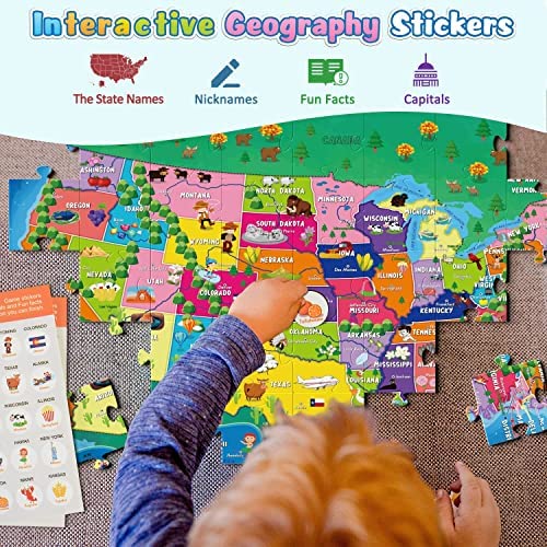 DOUBLE-SIDED PUZZLE- The puzzle was designed USA Map on front side and dinosaurs on back side. It’s more fun for kids. After a jigsaw puzzle is completed, encourage the kid to challenge himself again. Surprise! Pay one price & get two puzzles INTERACTIVE PUZZLE- Equipped with interactive geographic stickers so that kids can hands-on play! Learn about the States, Capitals, interesting facts and build fundamental American geography skills ADVANCED PAPER GAME- Equipped with paper cutting and origami, kids can challenge to create a three-dimensional figure. This design is mainly for kids to further train spatial thinking in practice DEVELOP SKILLS- This USA map puzzle helps kids develop multiple skills, such as image recognition ability, spatial imagination ability, problem solving, and geographical knowledge 54-PIECE PUZZLE- The 54-piece double-sided puzzle toy is designed especially for kids ages 3 and up. The finished puzzle measures 21 x 15 (inch) Kid’s Favorite Gift- The puzzles are great gift choices for a birthday, Christmas, Easter and other holidays.Experimental results show when completing the puzzle, kids need to use their hands, eyes and brain. In this process, children will be very focused.