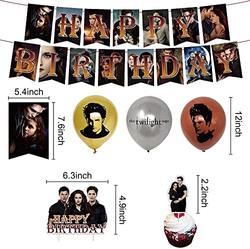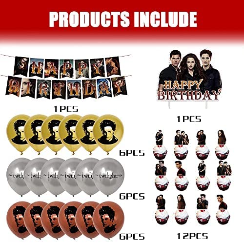 QICI Twilight Saga Birthday Party Supplies Twilight Saga Theme Party Decorations for Fans Include Happy Birthday Banner, Cake Topper, 24 Cupcake Toppers and 18 Latex Balloons