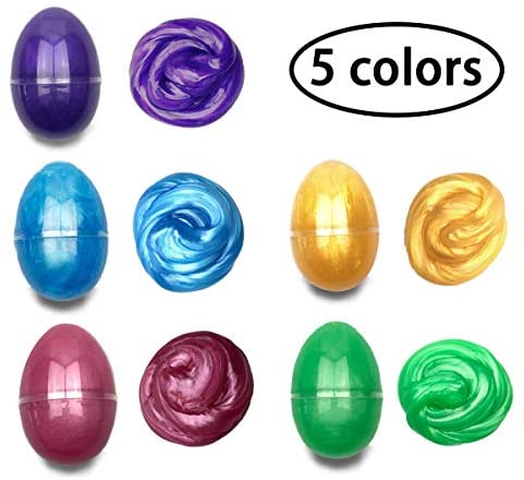 QINGQIU 5 Colors Egg Slime Toys Feature: 1. Not a real egg, but the slime in an egg shape container, so looks beautiful. 2. The 5 colors make your slime party more interesting. 3. Its soft, smooth, stretch long, it will not stick to the hands, clothes, walls or carpet, very easy to clean up. 4. Kids can use the slime diy what figure he wants, like animals, flowers, trees. 5. Exercise the kids coordination ability of hands, eyes and brain, develop the kids creativity and imagination. 6. Best for kids, girls, boys, stocking stuffers, christmas gifts, easter basket stuffers, easter basket filler, birthday gifts, school classroom rewards, carnival prizes, pinata, goodie bags. Specification: Color: blue, green, pink, gold, purple Weight: 2.2oz for one egg, 11oz for five eggs Size: 2.75 x 1.97 (7 x 5cm) Materials: Eco-friendly material, non-toxic Note: Due to temperature effects, it may not be used. Soak in hot water at 40 before used. After playing, put the slime back into the egg, can maintain softness. Dont bake! Dont eat! We dont recommend to mix the 5 colors together, as they will come to one color