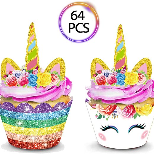 QMZ 64pcs Unicorn Cupcake Toppers and Wrappers Double Sided for Kids Birthday Baby Shower Theme Party Decorations Supplies Set of 32