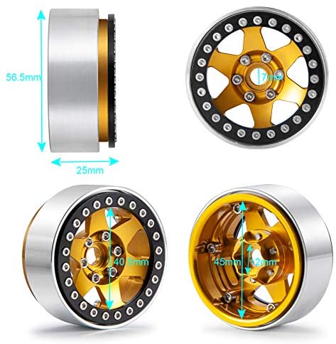 Specifications : Material: Metal Quantity: 4PCS Weight: about 70g/pc Outer Diameter: about 56.5mm/2.22inch Inner Diameter: about 45mm/ 1.77inch Thickness: about 25mm/ 0.98inch Drive Hex: 12mm/ 0.47inch Suit for: Fits 12mm/0.47inch hex hubs and most 1.9 inch size tires. Package include: 4 * 1.9 Inch Wheel Rims