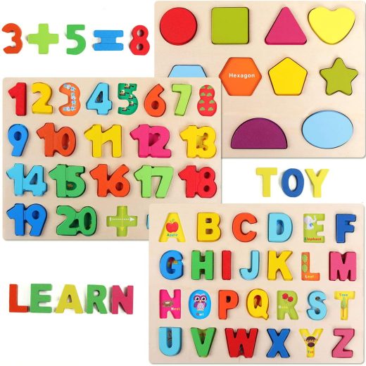 3 Pack childrens wooden puzzles contains One Alphabet Puzzle, One Numbers Puzzles, and One Shapes Puzzle. Different ways to keep children playing a…