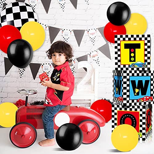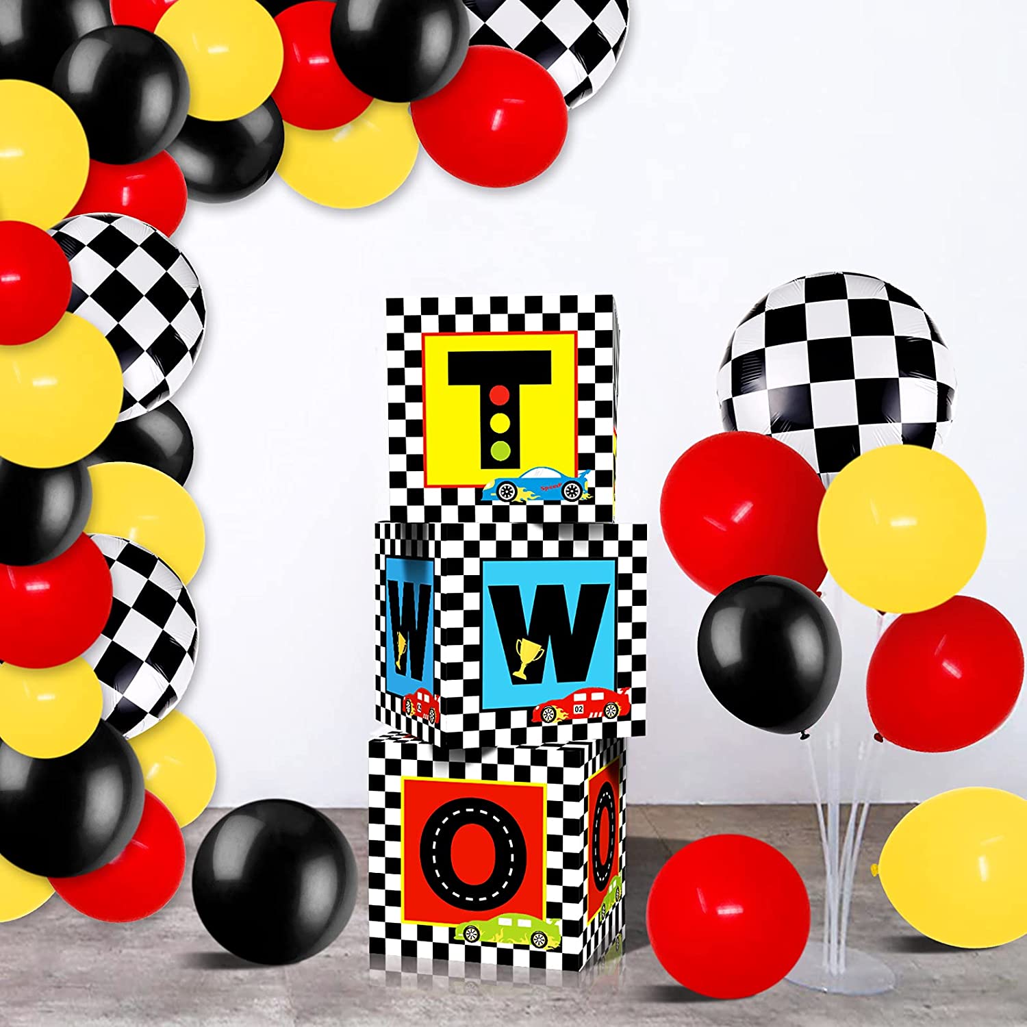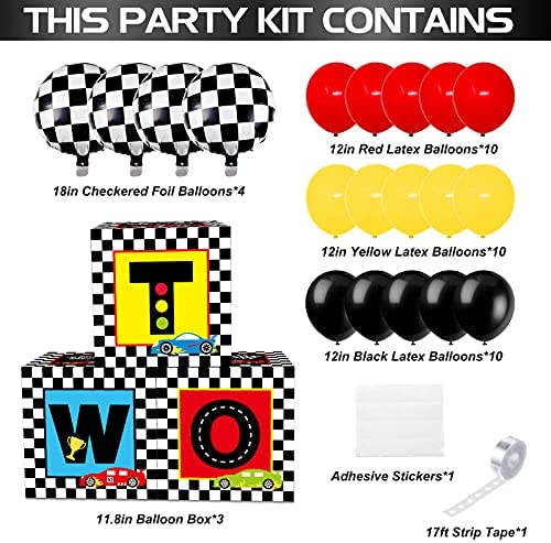 Race Car Birthday Balloon Boxes Decorations Including Racing Party Boxes Block, Red Yellow Black Latex Balloons for Two Fast 2nd Birthday Party Supplies Checkered Flags Backdrop Favor