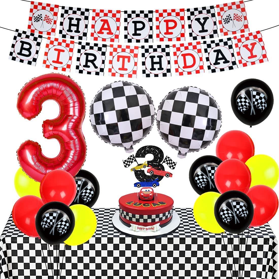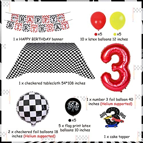 Race Car Birthday Party Supplies for 3 Years Old Boys Checkered Flag Balloons Tablecloth Cake Topper Letu2019s Go Racing Decorations Cars 3rd Bday Decor