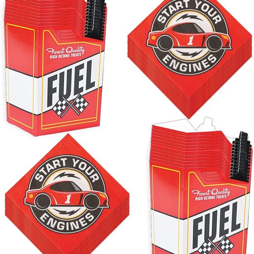 Start your engines with this Racing Fuel Popcorn Box & Napkin Set! Napkins with Start Your Engines text with fun fueling can popcorn boxes all in a vibrant red, black, & white color palette. Use this exciting set at your little speed racers birthday or any fast car fans party! Serve popcorn and other snacks for up to 24 guests. Plus, paper tableware makes cleanup a breeze!