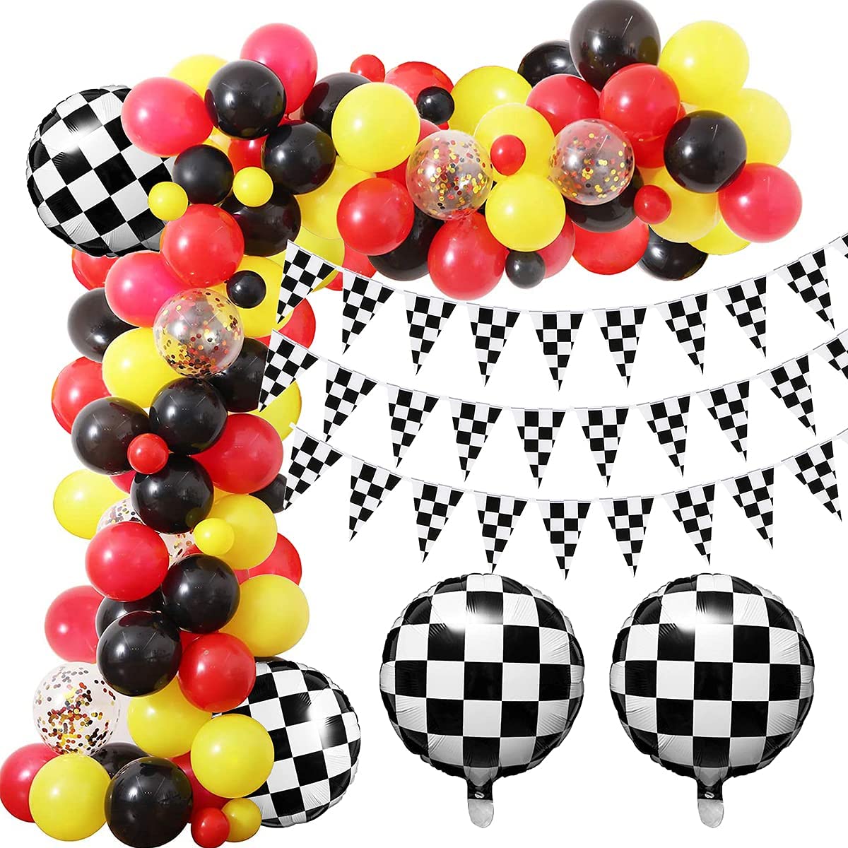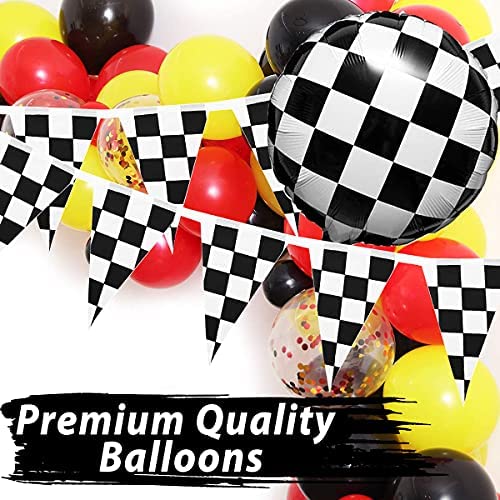 Racing Car Balloon Garland Kit, 126 Pcs Yellow Black Confetti Balloon Arch with 100ft Checkered Flags Banner Checkered Foil Balloons for Lets Go Racing Racing Car Party Decoration