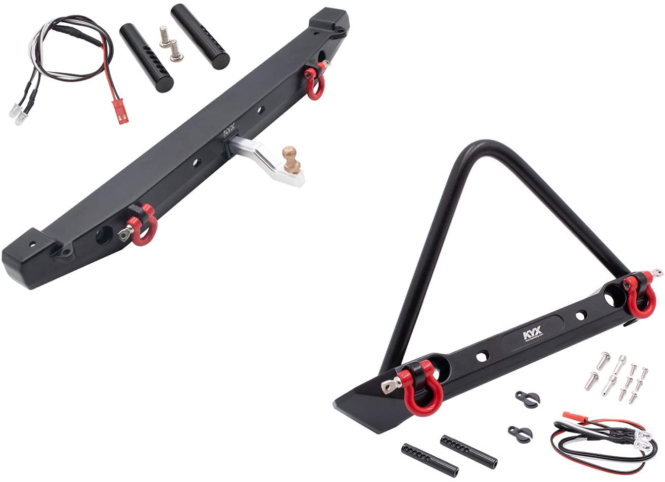Features: Type: Radio Control Toy Scale: 1/10 Material: Alloy Color: Black Front Bumper: 2pcs posts Rear Bumper: 2pcs 42mm posts(TRX-4), 2pcs 65mm posts(SCX10-II) Description: 1/10 Rc Crawler Alloy Front Rear Bumper set w/ Led lights towbar for Axial SCX10 II Traxxas TRX-4. This bumper is made of high quality alloy metal, its durable and easy for customers to install. Its unassembled, then players can enjoy assembling themselves. Package Included: 1pcs front bumper 1pcs rear bumper 2set led lights 1pcs tow bar 6pcs posts some mounting screws