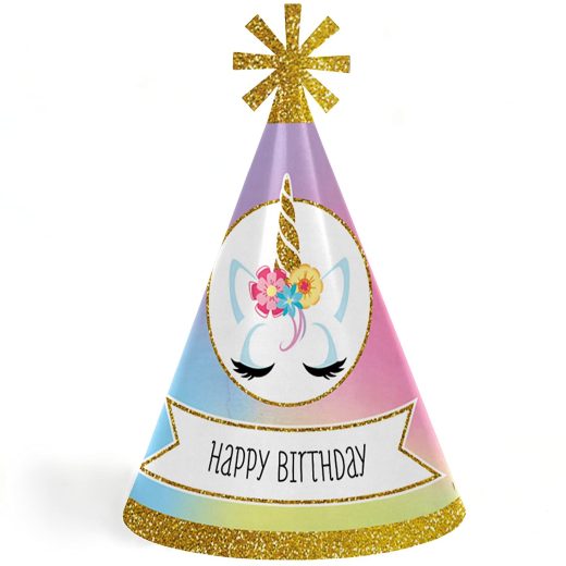 Everyone will be ready to celebrate the guest of honor’s birthday when wearing a Unicorn Birthday party hat. This set of 8 (Standard Size) birthday party hats is a great addition to your event and is sure to get everyone smiling – especially the guest of honor! Each Rainbow Unicorn – Cone Magical Unicorn Happy Birthday Party Hats for Kids and Adults perfectly themed and has a festive star at the top. These party hats even come with a “Happy Birthday” printed on them! Be sure to have your camera ready because this Magical Unicorn Birthday party hats are going to give you some great photos!