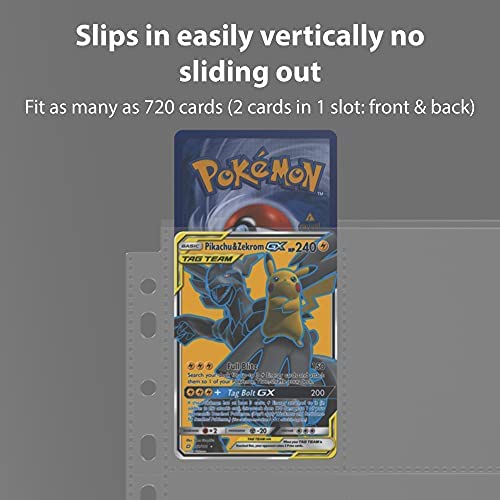 Fit 720 Trading Cards:Includes 40pc 9-pocket trading card pages, holding a total of 720 cards. Made from archival-safe, acid-free non-PVC material. Top Protection: Hard cover made with anti-scratch and water-resistant material. Secure zipper closure designed to keep cards intact, no more card spills. Transparent Pages: Flip through the pages, see through every detail and artwork without taking the cards out. Collectors Choice: A perfect combination of style and utility, keep your valuable collectibles in mint condition at all times. Wide Compatibility: Pocket size- 2.7x 3.7 in. Compatible with Magic the Gathering, Pokemon, YuGiOh!, Star Wars, Baseball, Football Cards along with many more.
