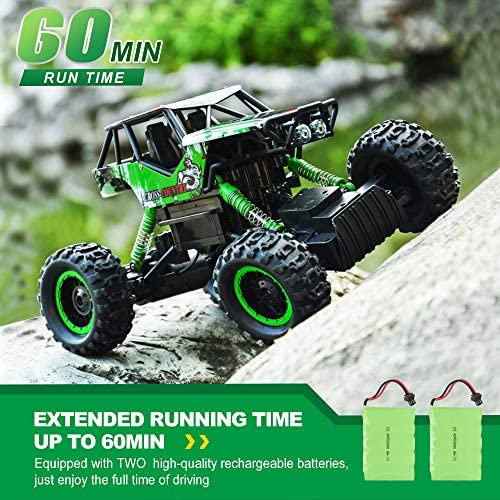 TWO RECHARGEABLE BATTERIES EXTENDED RUNNING TIME: Our rc car equipped with TWO 6V/800mAh rechargeable batteries, you can enjoy the fun of driving for about 60 mins time (which depends on the terrain). The USB charging cable will give great convenience for charging the monster truck.