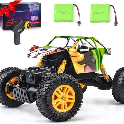EXCELLENT DRIVING EXPERIENCE: The 4 wheels drive remote control car is equipped with a high-quality unique rock shell and powerful built-in motors,This monster truck can easily pass through sand, grass, roads, rocky areas and other terrains.With anti-slip tires and shock absorbers give support to unexpected dropping and the unstable surface of the ground better protect the electronic components in the toy that allow you to drive the RC car in all terrains