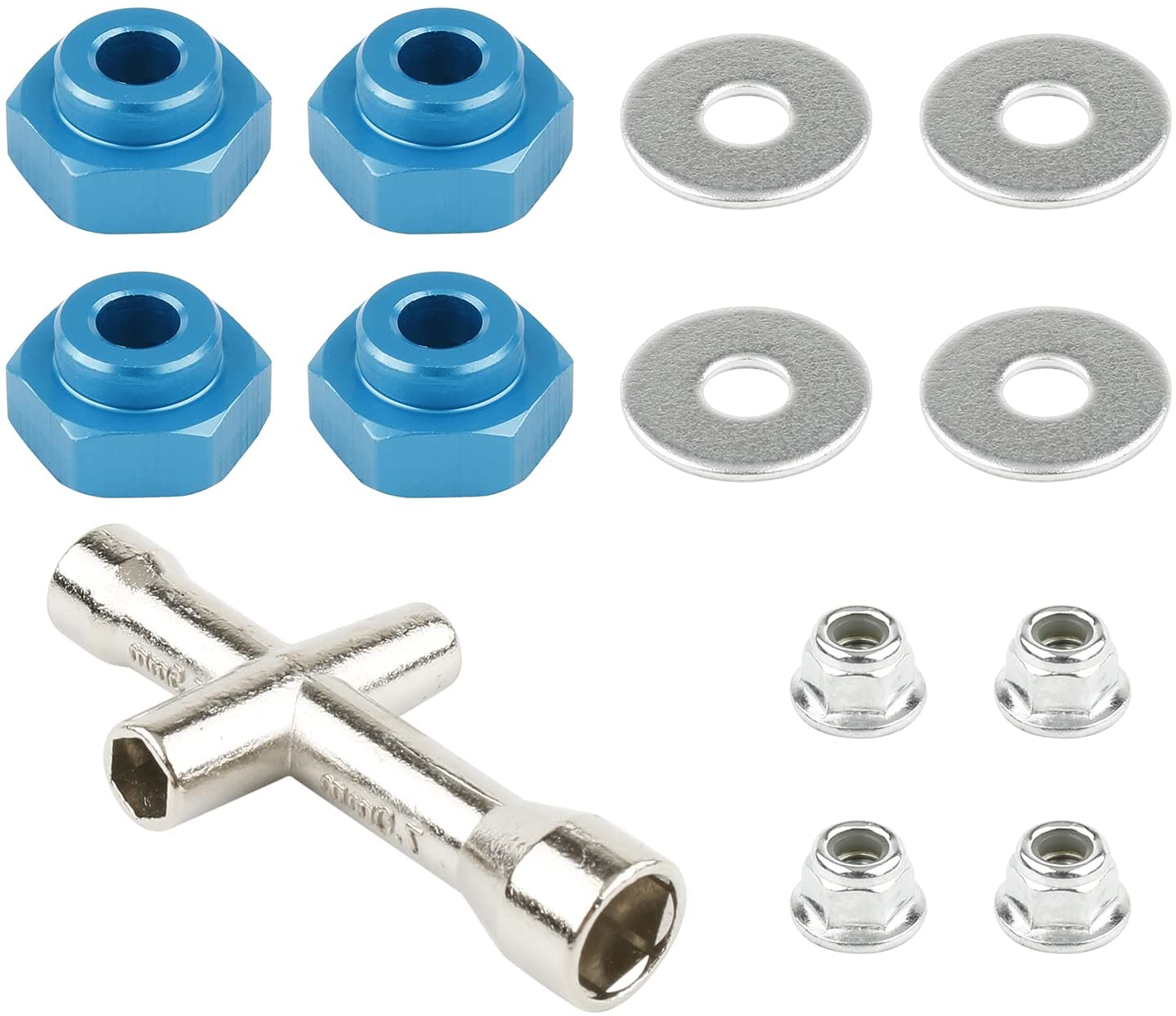 Material: Hex Adapter: aluminum alloy, anodized finish. M4 Lock Nut: carbon steel with nylon insert. 4-way Cross Wrench: zinc alloy with nickel plated. Applications: This 12mm to 17mm adapter is used for install 1/8 scale RC wheels on the 1/10 on-road or off-road cars. Package Included: 4×Drive Hex Adapters 4×M4 Nylock Nuts 4×Washers 1×Mini Socket Wrench