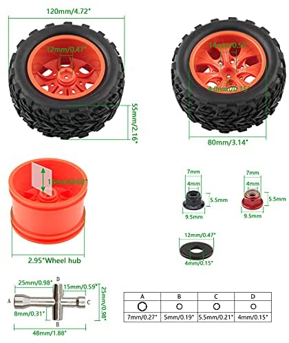 Features: Made of soft rubber and plastic wheel with foam insert, 7 spokes, need to be glued before using, high wear-resistant and excellent durability. Applications: Used for 1/10 scale off-road truggy, monster truck. How to Strengthen Rims: 1) First, make sure the wheel center hole size matches the original OEM rims. Sometimes you may need to drill out the center hole slightly so the rims fully fit over the axle shaft. 2) It is best to use nylon insert lock nuts with flanges. 3) Add a washer. Adding a washer to the outside of the rim will evenly distribute the force over a wider area. For added strength, glue the washer to the rim. (Its not necessary, depends on your demand) Package Included: 4×Wheels & Tires 4×Aluminum Flange Nylon Lock Nuts 4×Carbon Steel Flange Nylon Lock Nuts 4×Washers 1×Cross 4-way Socket Wrench