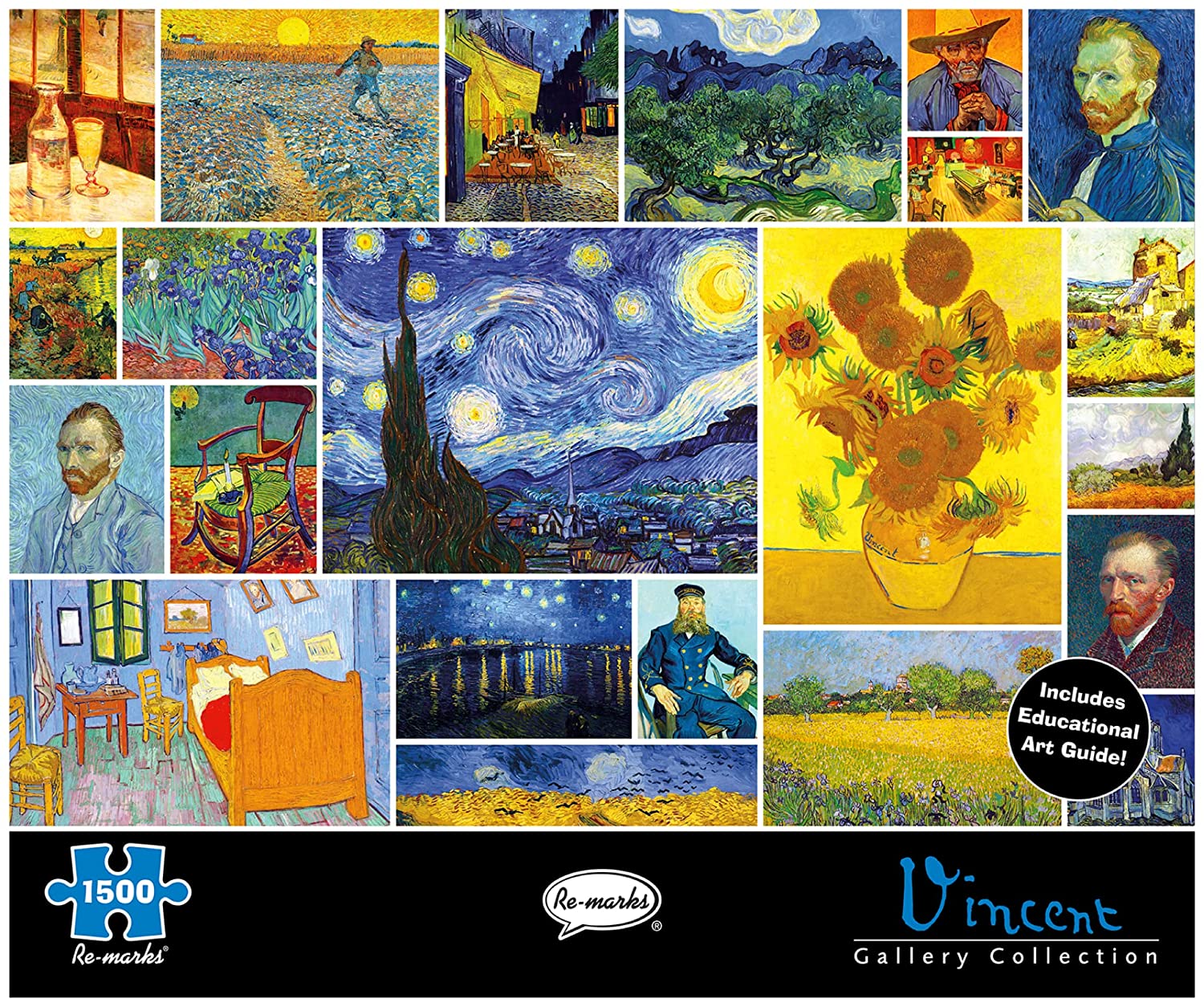 FUNCTIONAL FINE ART: This jigsaw puzzle for adults and kids features a collage of Van Gogh’s most notable works of art. Beautifully designed with rich colors and detail, this Van Gogh puzzle captures the beauty of the artist’s work. Immerse yourself in the works of Van Gogh with this amazing puzzle. A PUZZLE FOR EVERYONE: This art puzzle consists of 1,500 puzzle pieces and measures 24 L x 33 W when assembled. The pieces fit together smoothly, making this a great puzzle for the whole family. Everyone is sure to enjoy the challenge and entertainment that this 1,500-piece jigsaw puzzle brings! DIGITAL TIME-OUT: Take a time-out from TVs, phones, tablets, and other electronic devices. This big puzzle is both fun and engaging, giving you an activity that you can enjoy for hours! Have fun putting it together by yourself, or have a puzzle night with friends and family. QUALITY MATERIALS: We pride ourselves on using high-quality materials when constructing our puzzles. We use resource-efficient materials to produce our products, including sturdy reusable puzzle boxes and die-cut puzzle pieces that are crisply made using powerful machinery. RE-MARKS, A STEP ABOVE: We believe that there is no end to the demand for fun, tactile, and inspiring designs that encourage time away from digital clutter. Our goal is to generate functional products that have the look and feel of fine art. Our customer service team is dedicated to answering customer questions so you can keep learning!