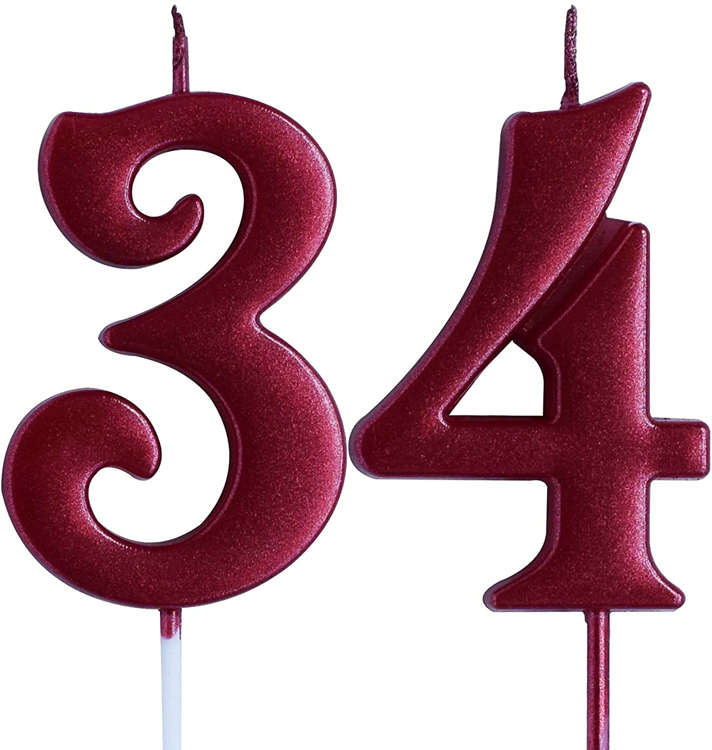 Red 34th Birthday Candle, Number 34 Years Old Candles Cake Topper, Woman Or Man Party Decorations, Supplies